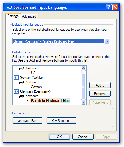 Download and extract the zip file. Install the keyboard layout by double-clicking on ‘setup.exe’ and run the registry hack ‘altgr.reg’ to map the left alt-key on altgr. I’m not sure if you need a reboot here (can’t remember) but it doesn’t harm. Then choose the new keymap, by pressing the right mouse button on the ‘DE’ button in the language bar in the task bar and choose “Settings…”. Choose “German (Germany) – Parallels Keyboard Map” as the default input language.